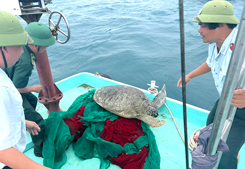 Sáng 21-2, Chi cục Thủy sản Khánh Hòa phối hợp Trạm Biên phòng Hòn Rớ (Đồn Biên phòng Cửa khẩu Cảng Nha Trang), Ban Quản lý vịnh Nha Trang tổ chức thả 1 cá thể rùa xanh quý hiếm về môi trường tự nhiên tại vùng lõi Khu bảo tồn biển Hòn Mun (TP. Nha Trang). Trước đó, khoảng 5 giờ sáng cùng ngày, cá thể rùa xanh có chiều dài 1,4m, chiều ngang 0,75m, nặng khoảng 90-100kg bị vướng lưới ngư dân trong quá trình khai thác, ngư dân đã giao nộp cho lực lượng chức năng để thả lại về tự nhiên.